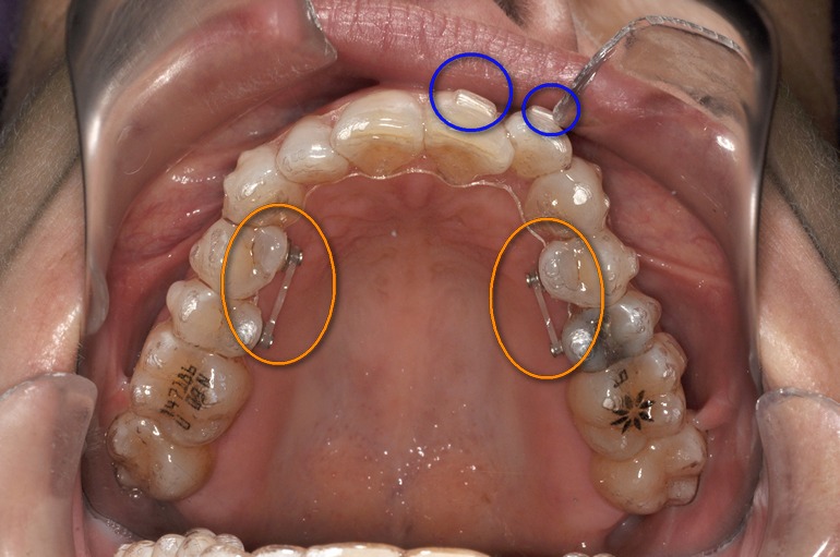 Con el cuarto alineador han venido los ataches. Unas pequeñas cuñas pegadas en los dientes que ayudarán al alineador a que mueva los dientes en la dirección que quiere (he marcado algunos con círculos azules). Y con los ataches llega la incomodidad de extremar la limpieza cada vez que comes para que ningún resto de comida se quede enganchado a ellos. También me han colocado 4 botones en la parte interna de mis dientes superiores enganchados con una cadena para conseguir mayor presión (círculos naranjas). Esto no es necesario en todos los casos, pero sí en el mio. Mi lengua está continuamente tropezando con ellos. Una guerra que apaciguo con un poco de cera para que no se me hagan llagas. He llegado a la conclusión de que por muy invisible que sea no deja de ser una ortodoncia y requiere del esfuerzo y la paciencia del paciente. No obstante he visto el final del tratamiento y sigo muy motivada.