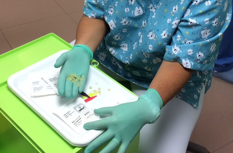 Un masajeador de encías. Se pasa entre los dientes y las encías y ayuda a eliminar la placa. Ah, lo puedes usar para quitar algún resto de comida enganchada en las brackets.